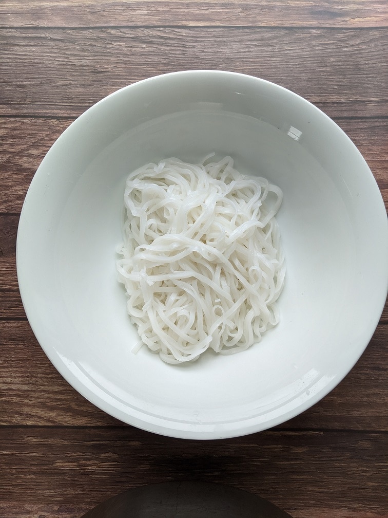 While the broth is cooking, you can make your noodles. Pho noodles are rice noodles. You can buy thick or thin ones, that's up to you. These are the only ones I can buy here, and they worked pretty well. Every rice noodle is going to cook differently, so follow the instructions on the package. Rice noodles have a nice chewy texture and the added benefit of being naturally gluten-free. Cook the noodles, rinse them well in cold water, drain them, then cover them and put them in the fridge until you are ready to use them. They will last in the fridge for up to three days. If they are all stuck together when you want to use them, rinse them in cold water, and they will come right apart.