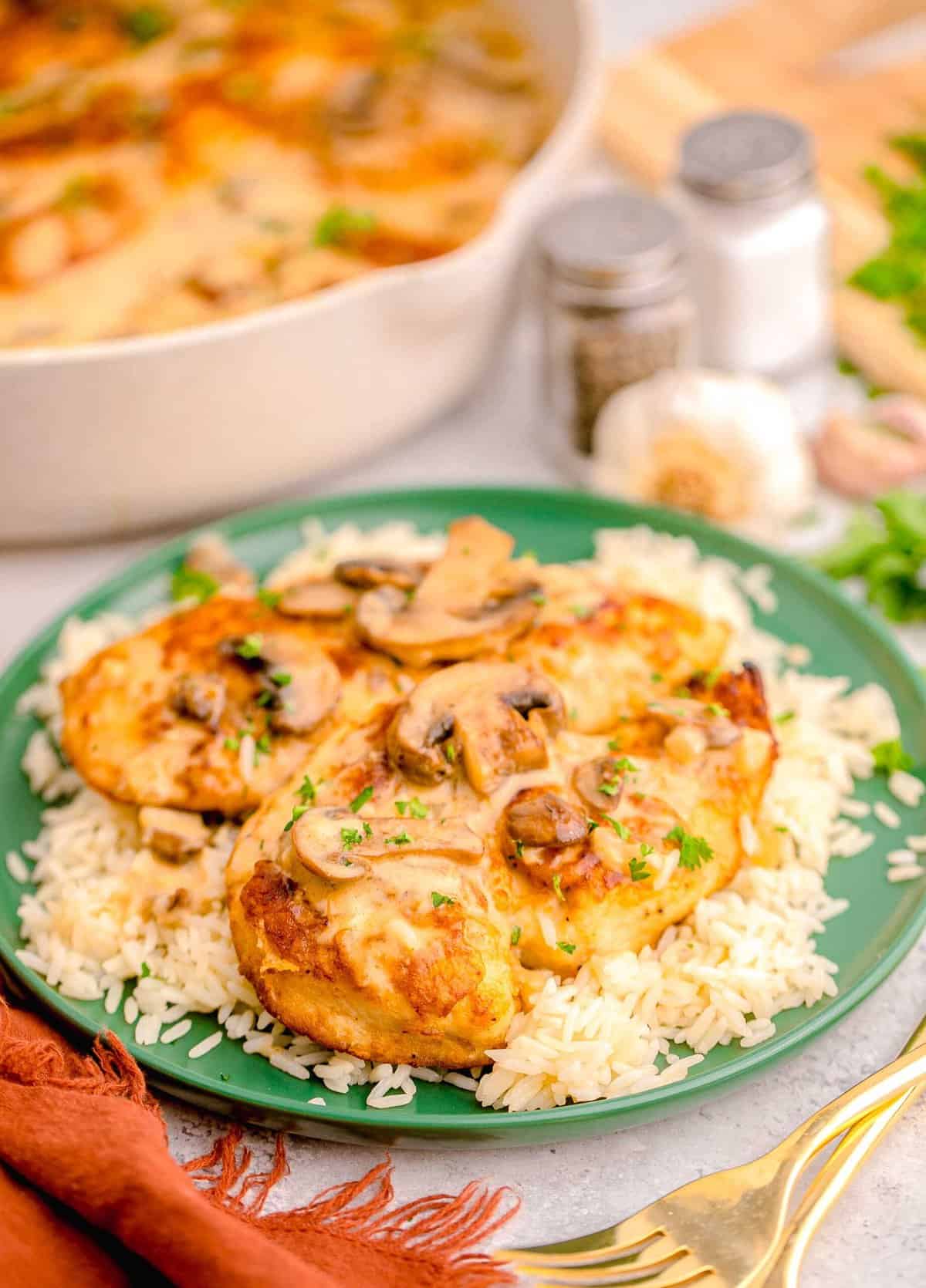 Seared chicken breasts nestle into a rich, earthy, and deeply savory cream sauce loaded with mushrooms and onions.