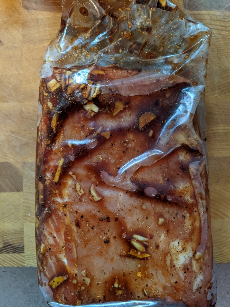 - Put all of the marinade ingredients in a large ziplock bag except the pork.