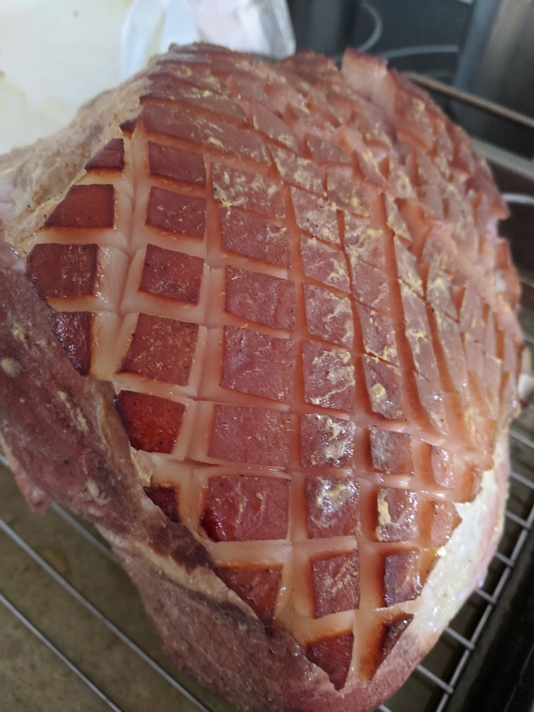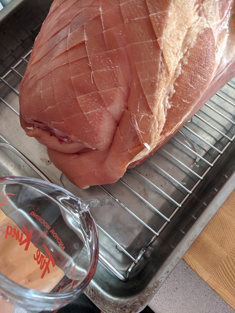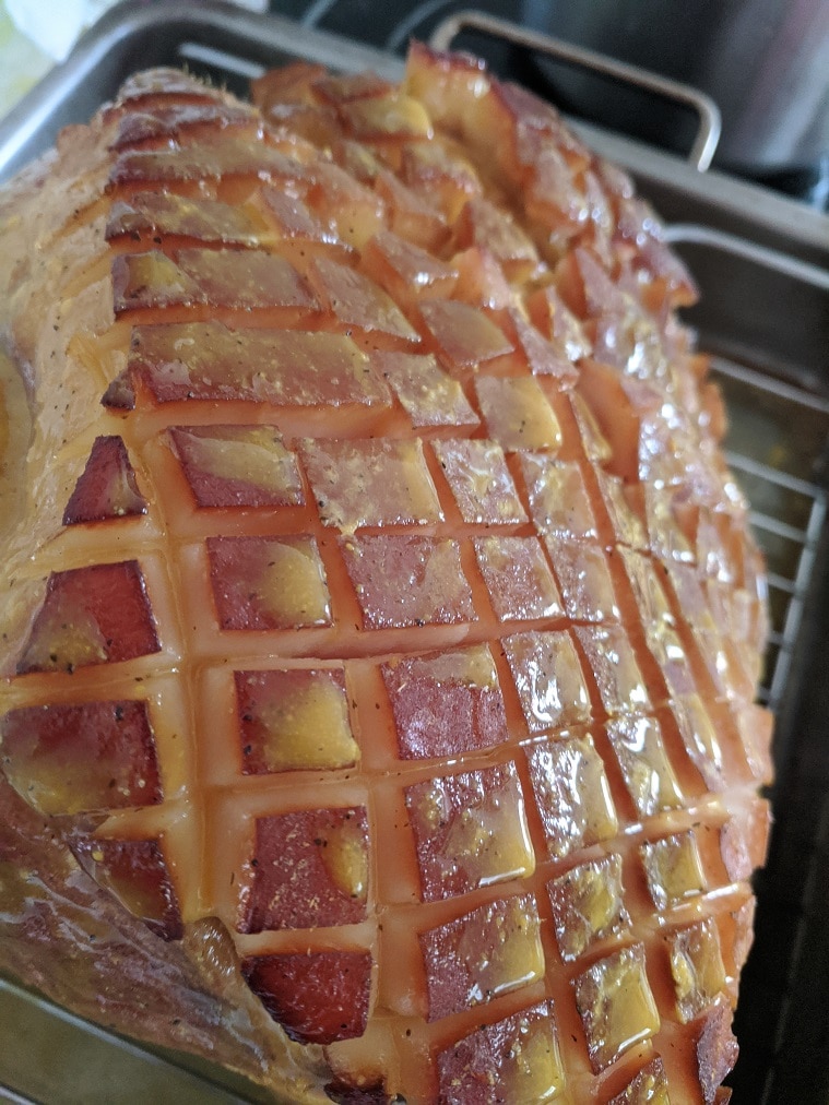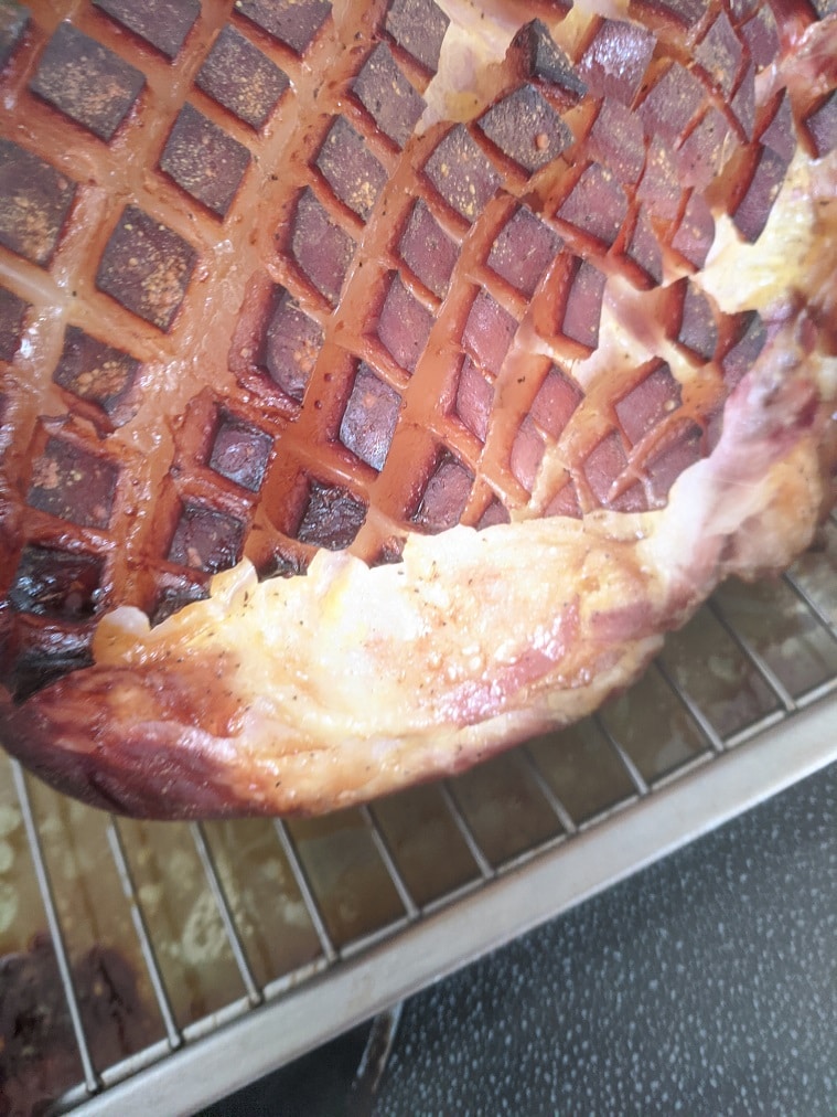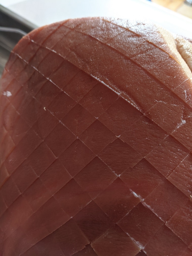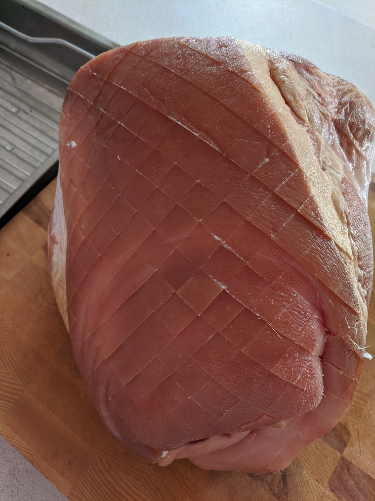 Once the glaze is made, set it aside and turn your attention to the ham. Put it skin-side up on your cutting board. Using a sharp (it has to be sharp) knife, make shallow parallel slices about a finger width apart the whole way across the ham. Give the ham a quarter-turn (turn it by 90°), repeat the process, cut across the first cuts and create a diamond pattern in the skin or a bunch of little squares, depending on how you look at it. This will do two things. It will help the ham cook evenly, and it will help the flavour of the glaze penetrate a little deeper into the meat.