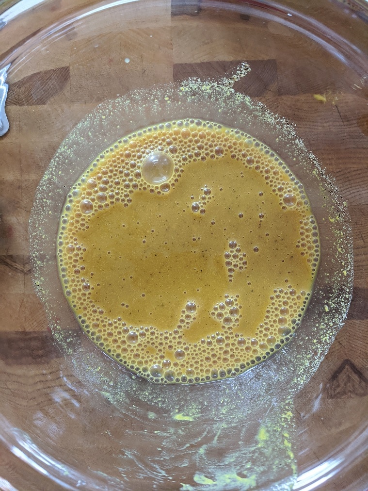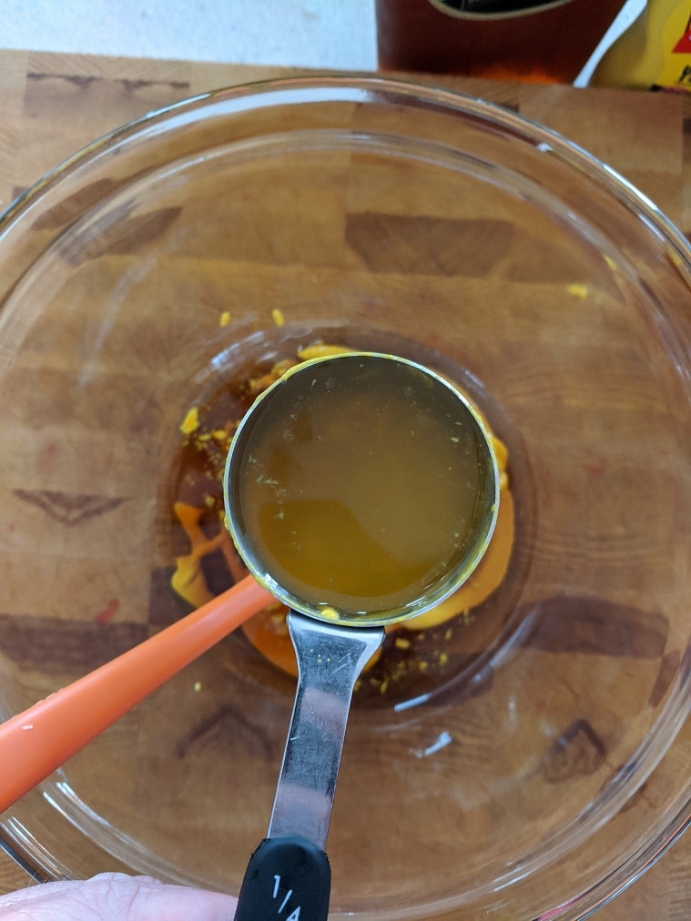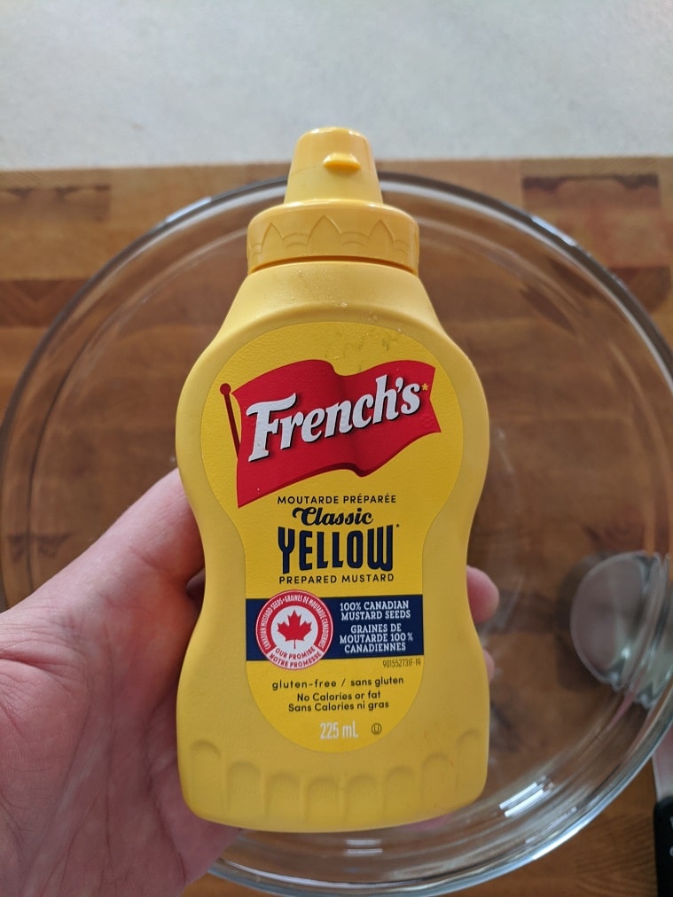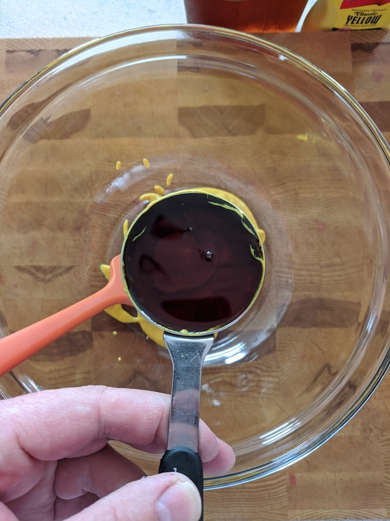 First things first, we need to make the glaze. It is a quarter cup each of yellow mustard, maple syrup (real maple syrup), cider vinegar, and a half teaspoon of black pepper. Put all the ingredients in a bowl and whisk with all your might until the mixture looks uniform.