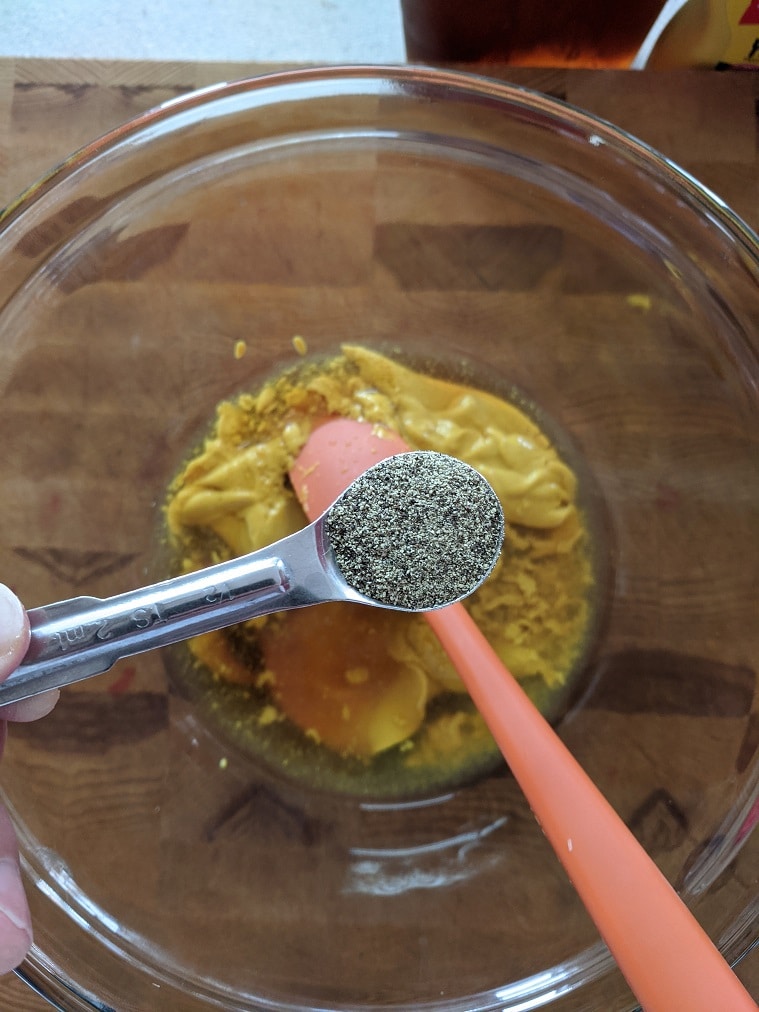 - In a medium mixing bowl, mix the maple syrup, mustard, cider vinegar, and pepper.