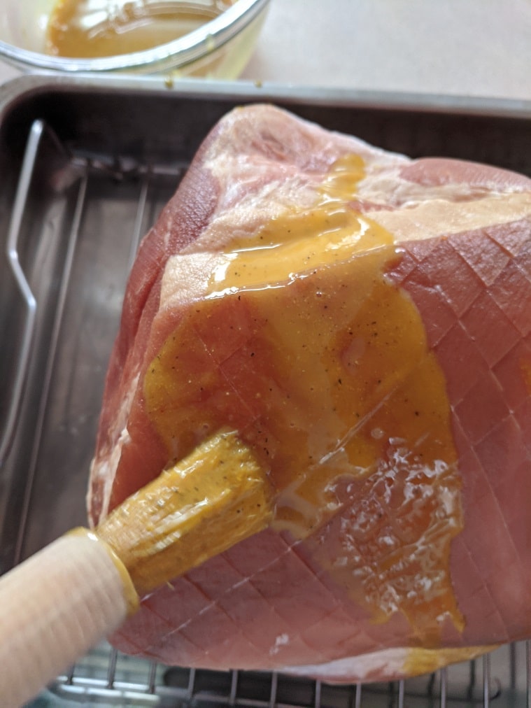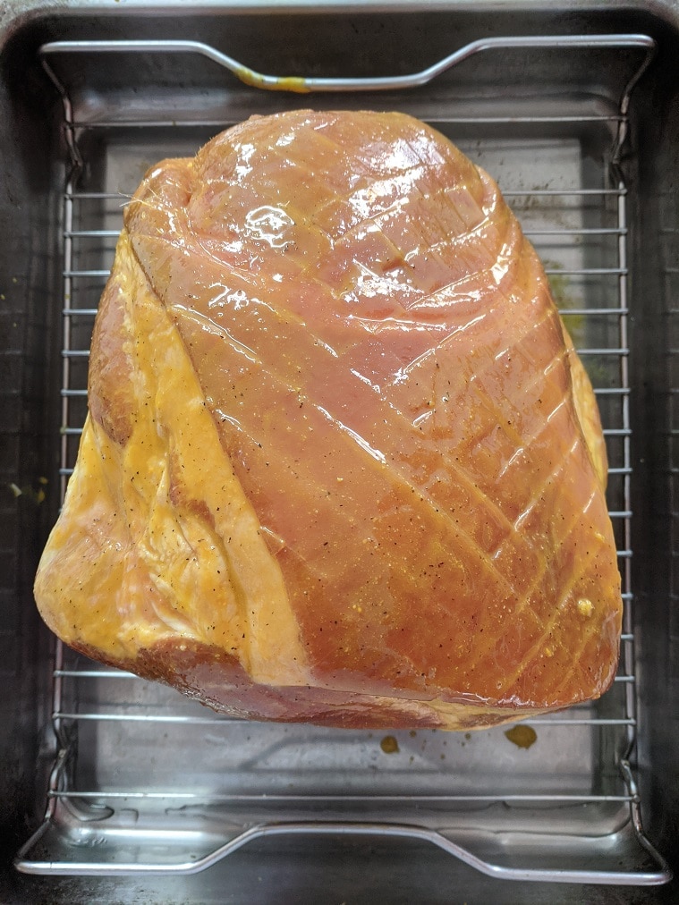 Note* I very rarely cook food in direct contact with aluminum foil. Any acidity, which this ham has from the mustard and vinegar, will degrade the foil, which may leach chemicals into your food. I almost always put a piece of parchment between my food and the foil. You can do it or not, but that is what I recommend.