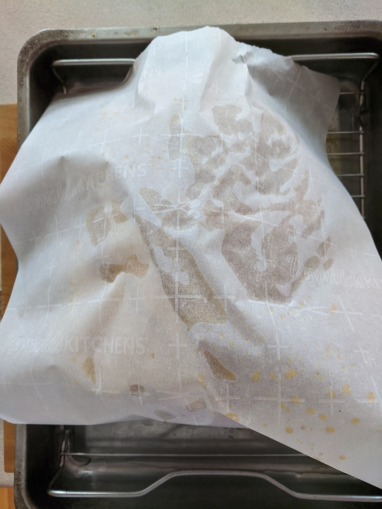 - Place a large piece of parchment paper on the ham, then wrap tightly with foil.