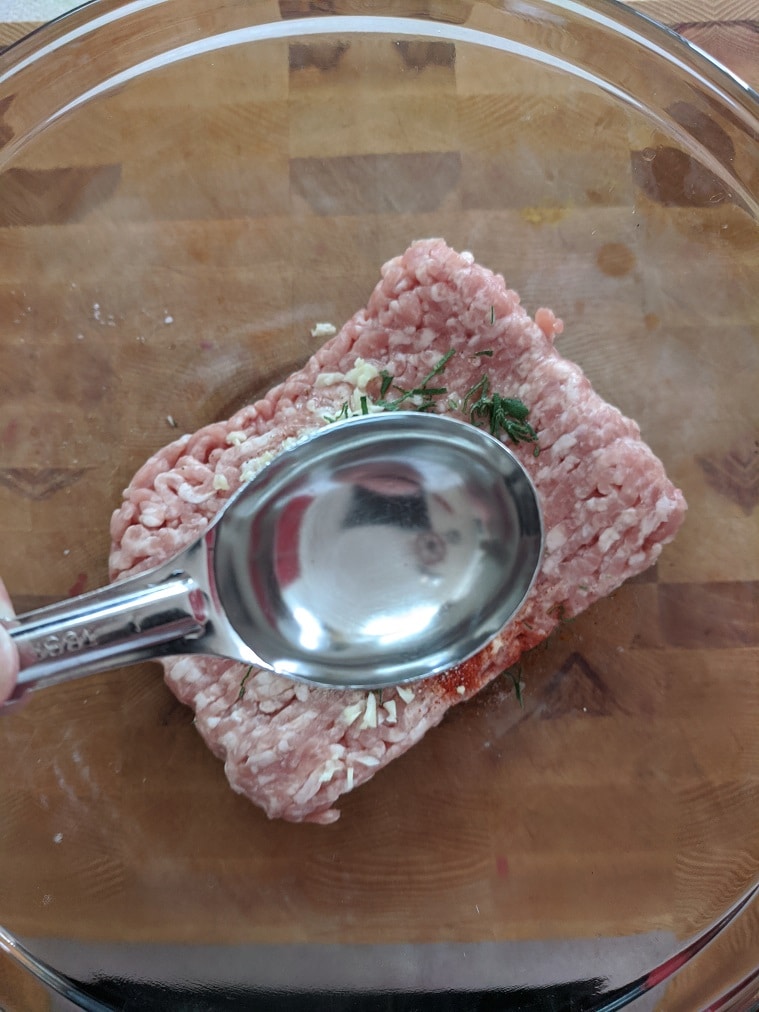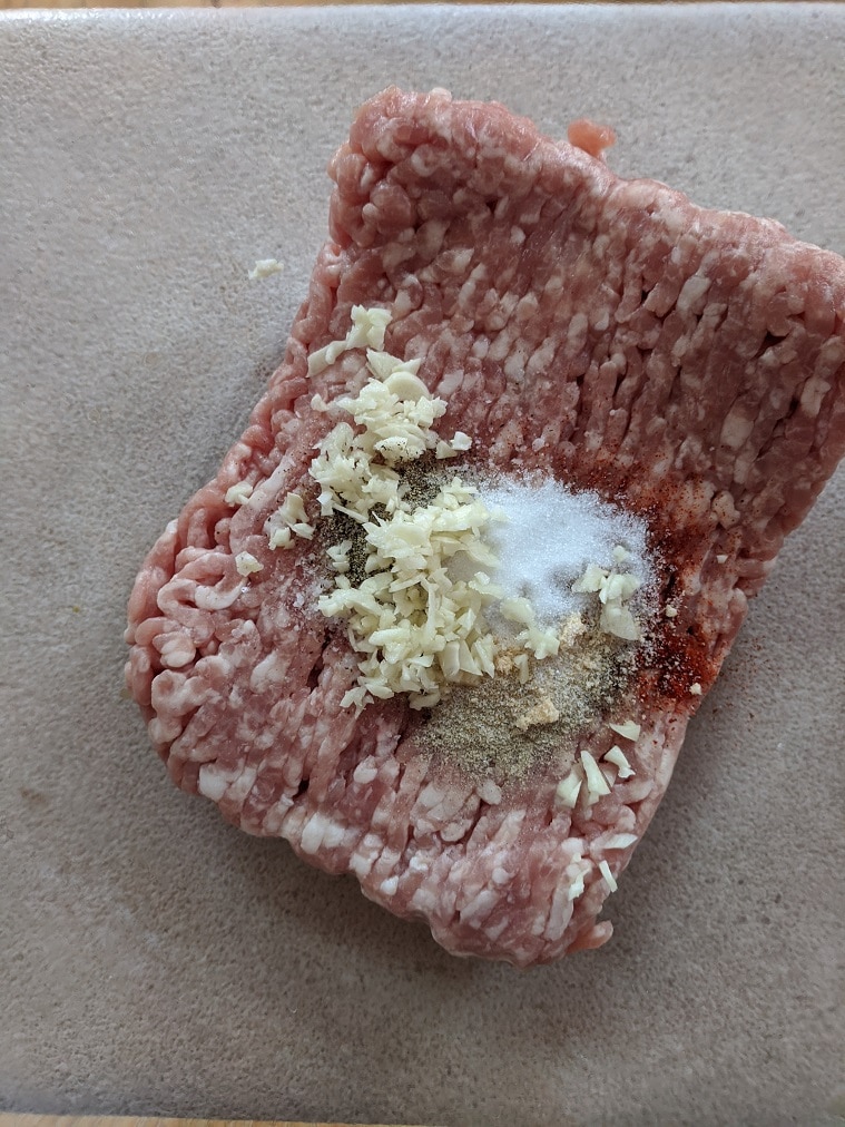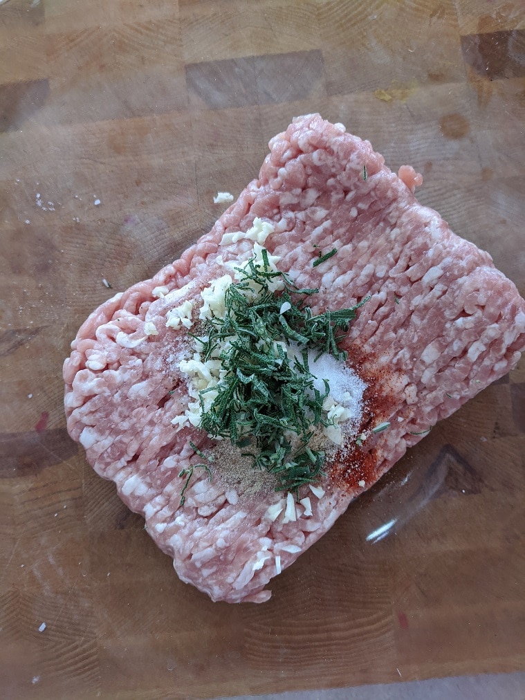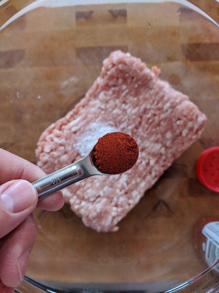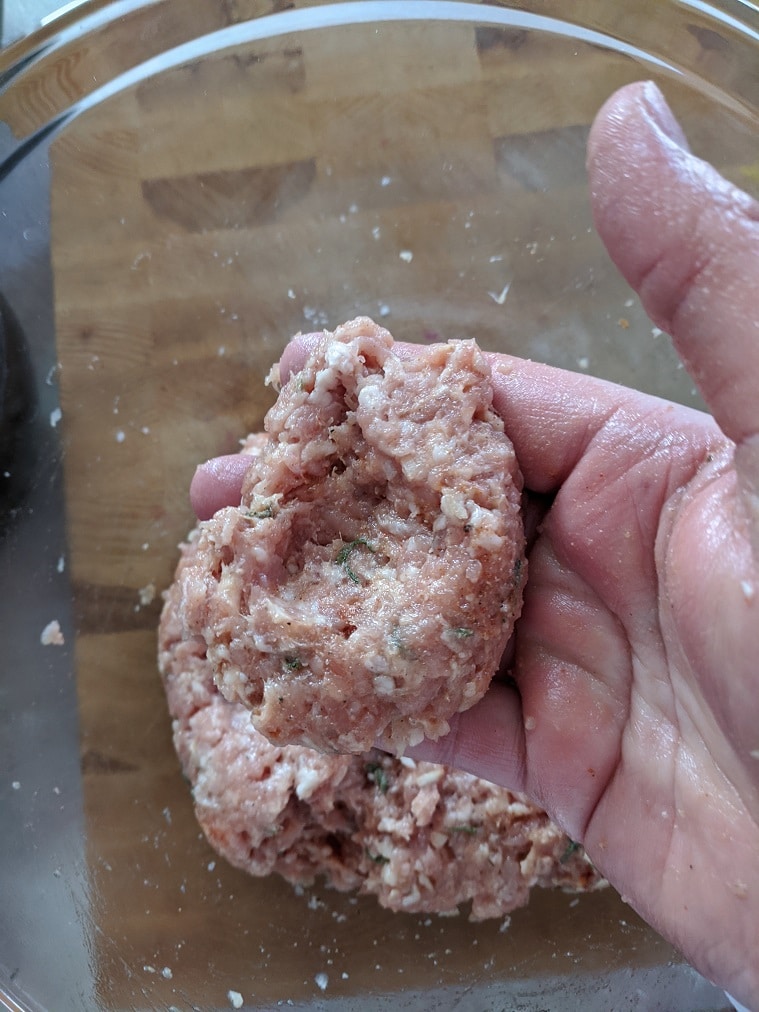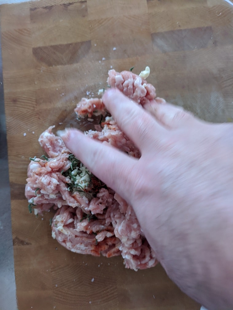 - In a medium mixing bowl, combine the pork with the salt, paprika, sage, black pepper, white pepper, cayenne, cloves, onion powder, garlic, sugar, and water. Mix well, then divide into six evenly-sized balls.