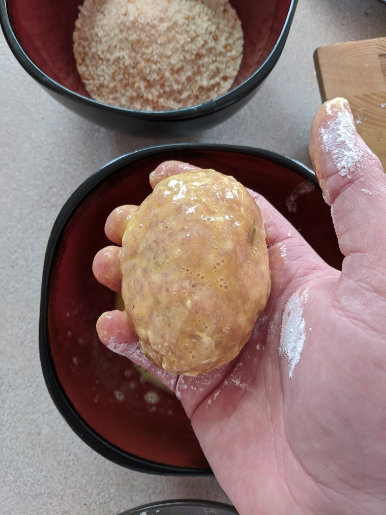 - Flatten one of the sausage meatballs into a thin patty and wrap it around one of the eggs. Form the meat around the egg, making sure there are no gaps. Repeat until all six eggs have been wrapped.