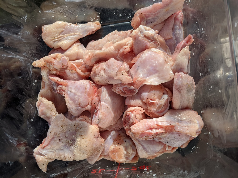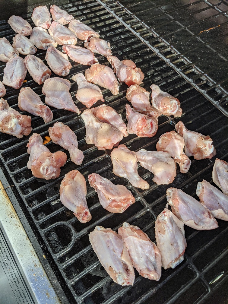 First things first, I heated my barbecue up over medium heat. Then I went to work on the wings. For the wings I used about two pounds which were slipt meaning the wings and drums were separated. I seasoned them lightly with salt and pepper. Lined them up on the grill then shut the lid and let them cook for four or five minutes.