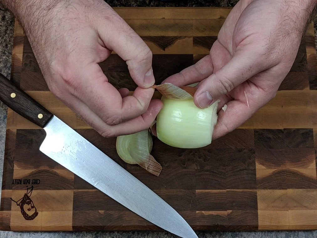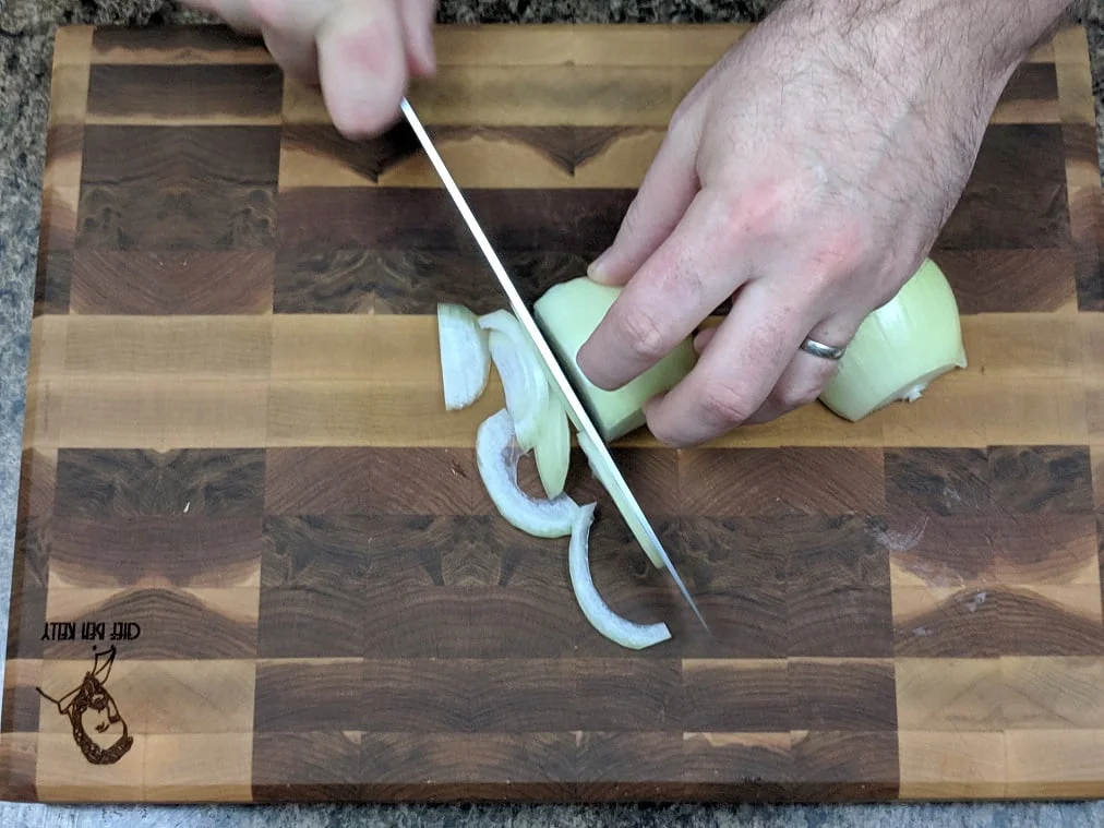 I first cut off the top and bottom of the onion and then cut it in half down the middle. Next up was to peel the onion and then thinly slice it along the grain.