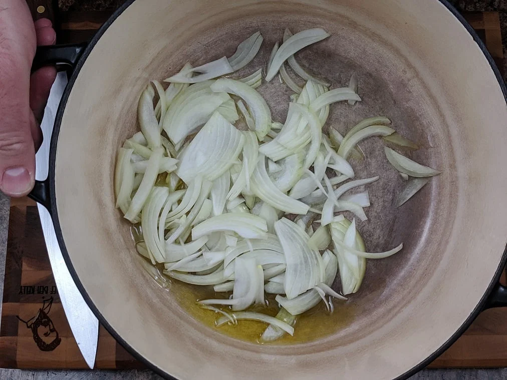 While I was slicing the onion I had my pot preheating over medium heat. Once it was hot I added 2 tablespoon olive oil along with the sliced onion.
