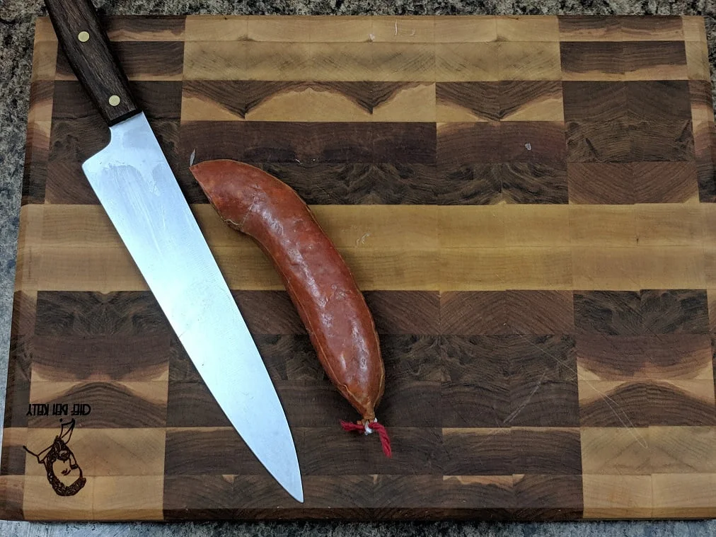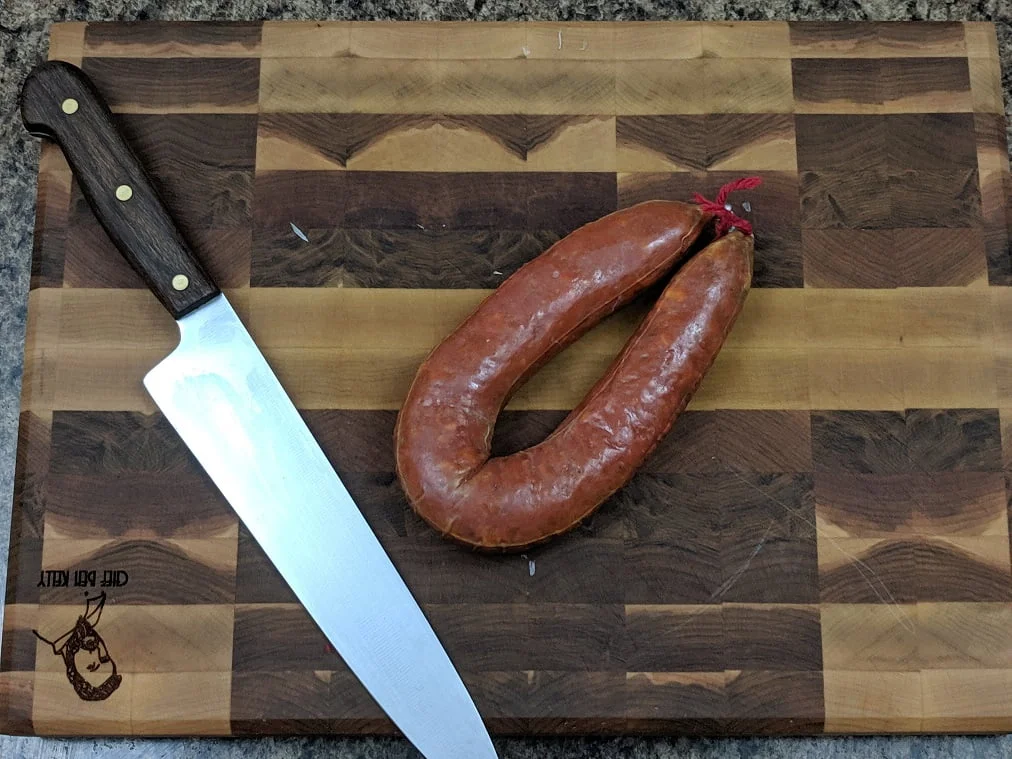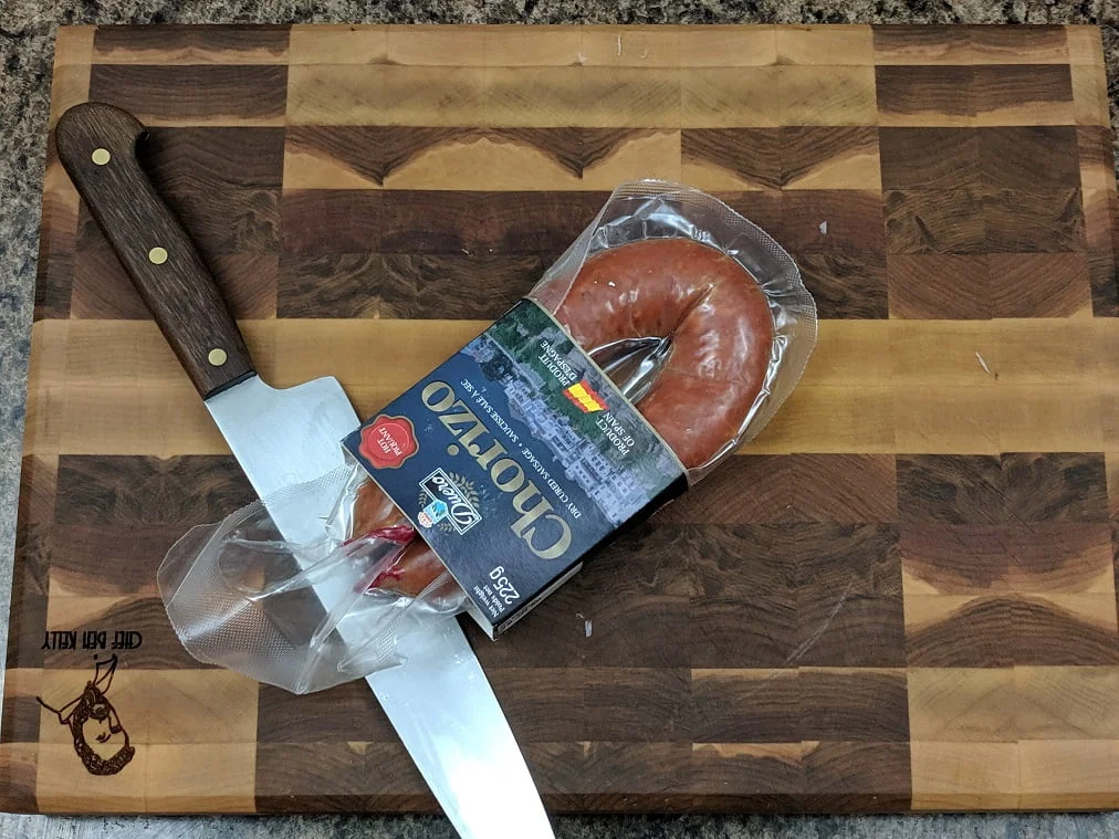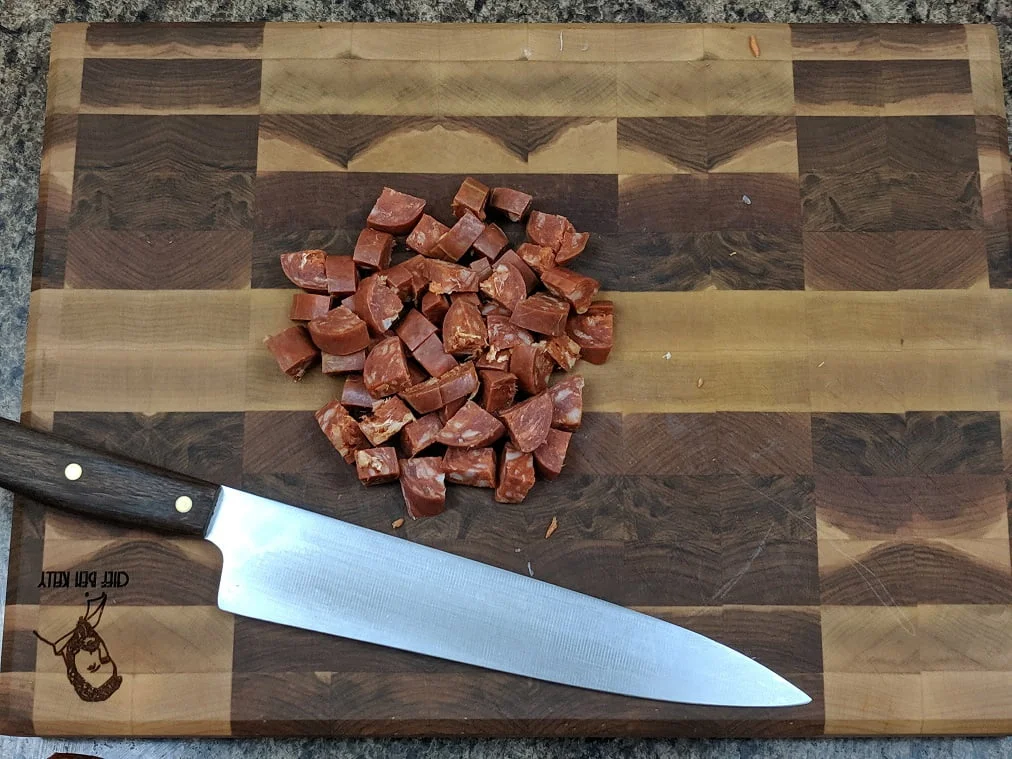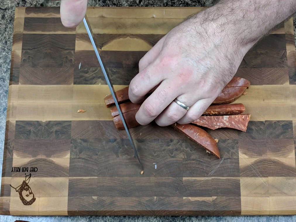 As the onion was cooking I went to work on the chorizo. I only used half a link which is about the equivalent of one standard sausage. Also, the chorizo I used was dry cured not fresh.