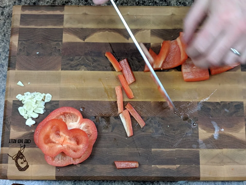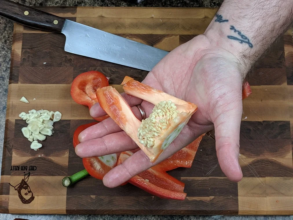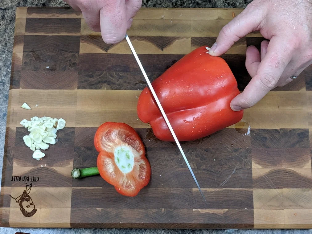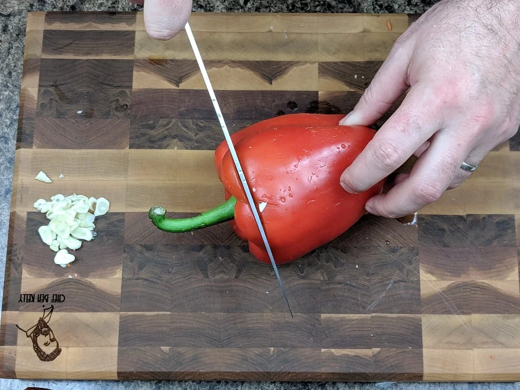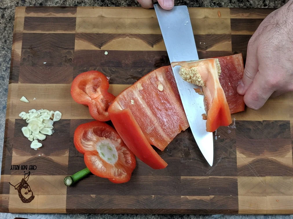 For the red pepper I cut off the top and bottom. Then I sliced through one side of the pepper. I put my knife inside the pepper and cut the ribs free while unrolling the pepper. This allowed me to take the seed pod out in one piece without making a big mess. This also prevented me from wasting any pepper.