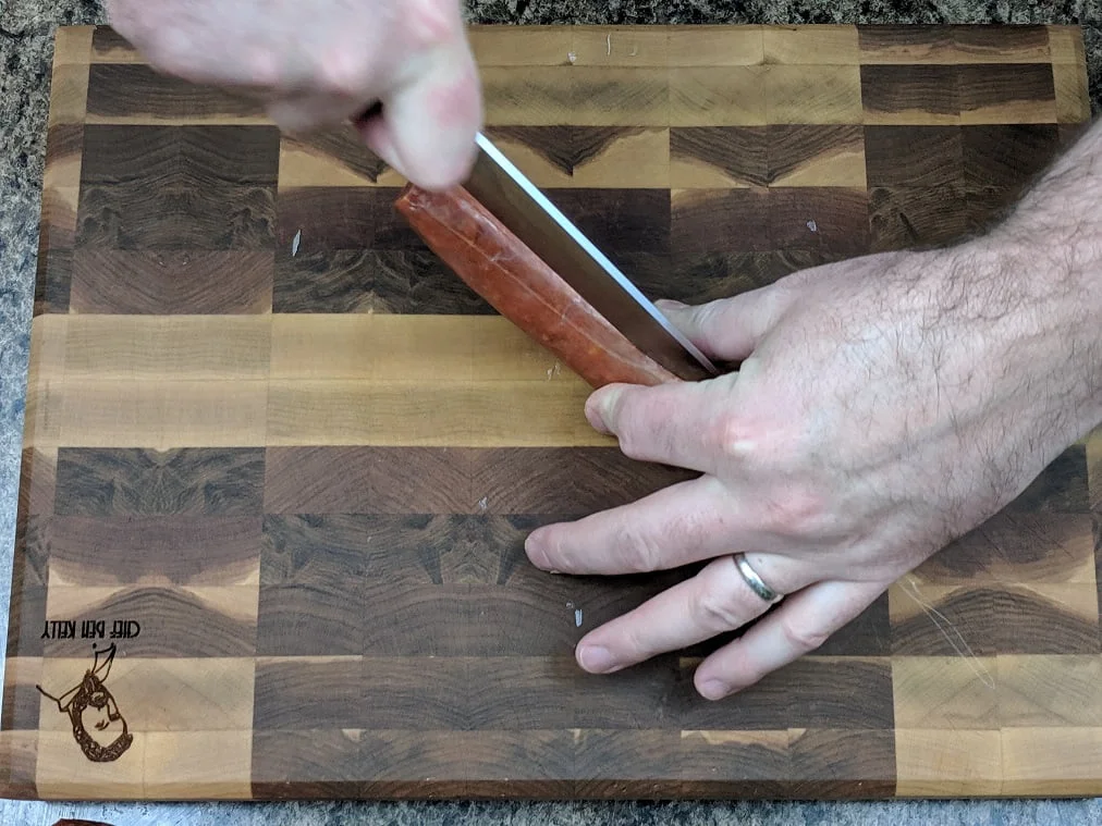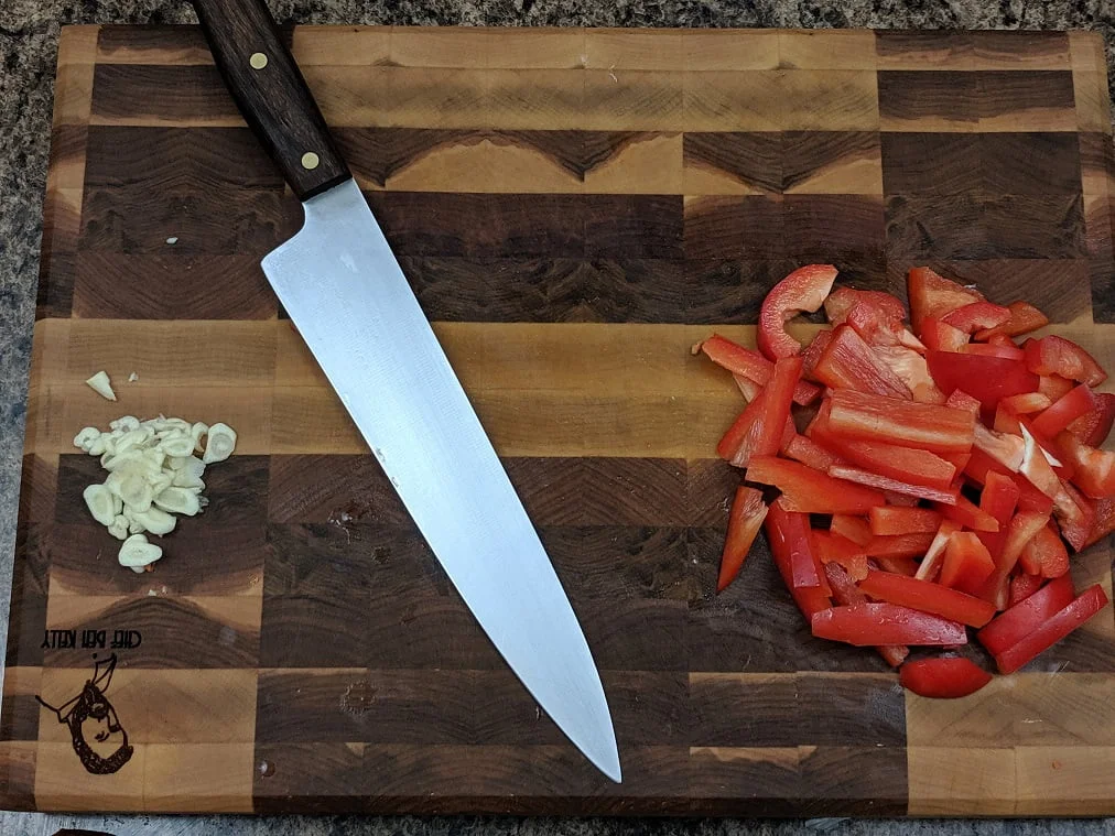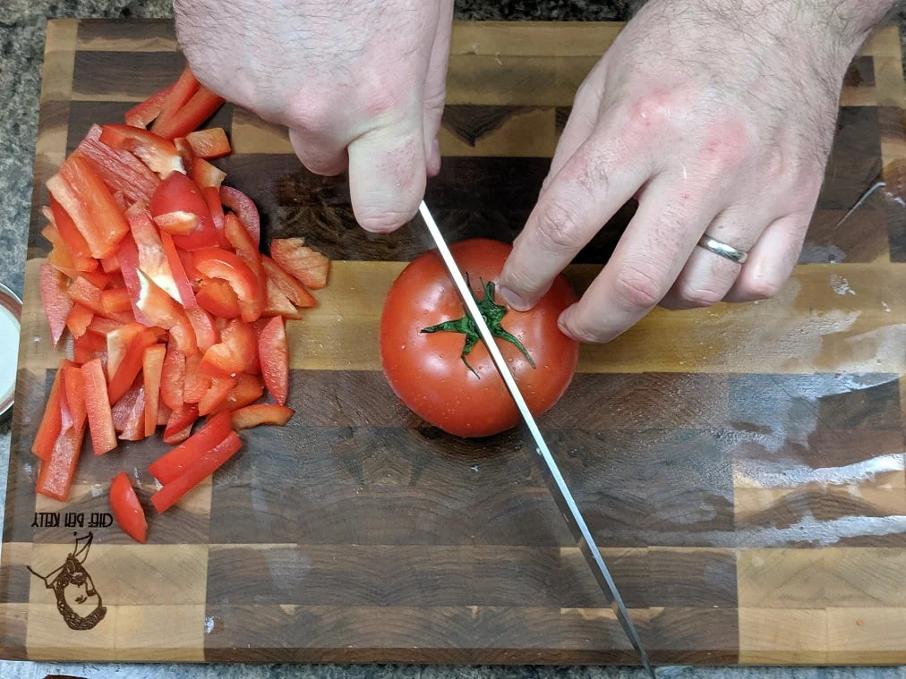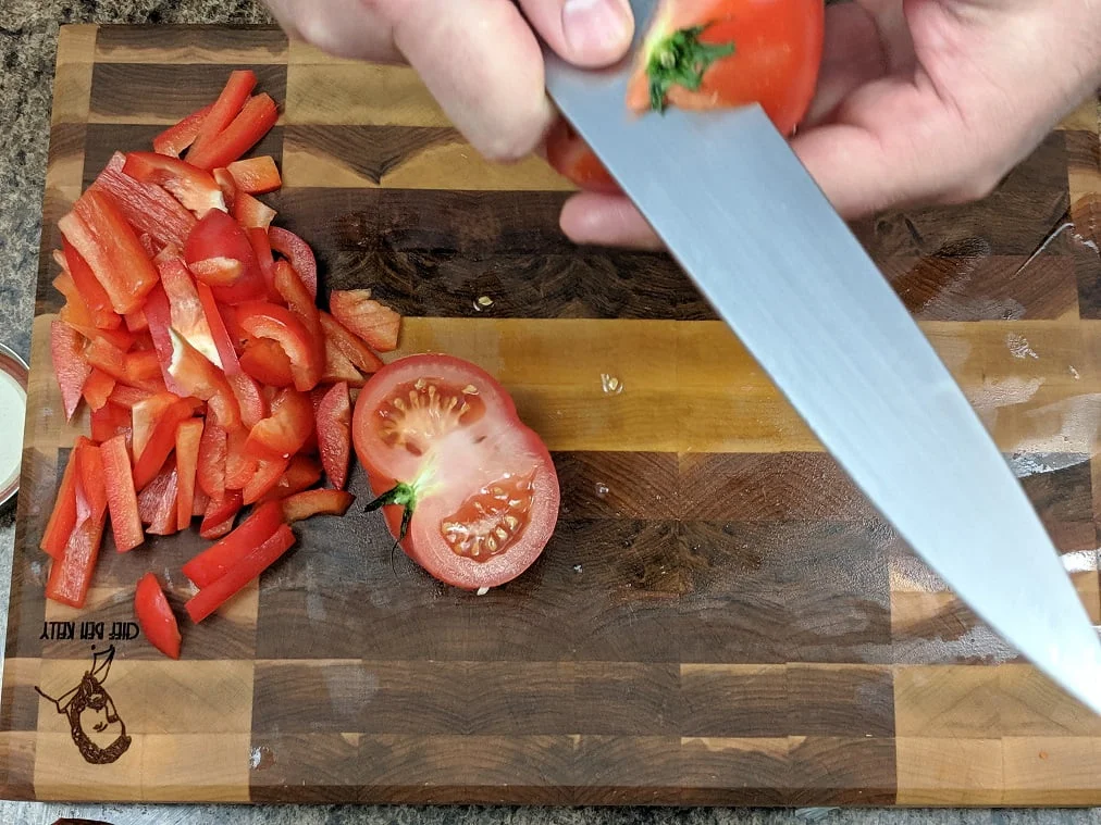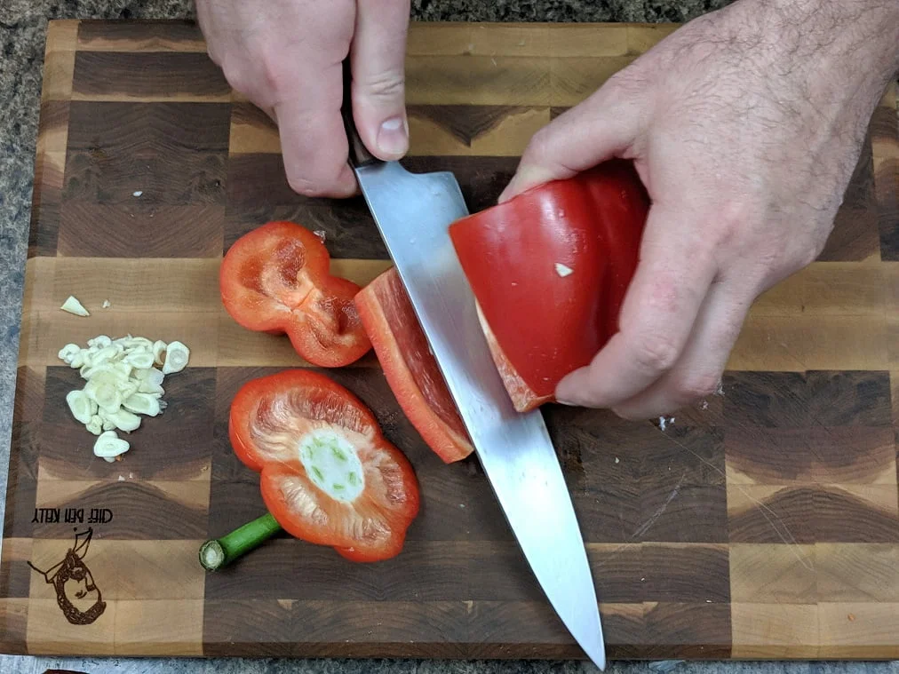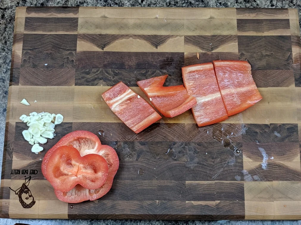 For the red pepper I cut off the top and bottom. Then I sliced through one side of the pepper. I put my knife inside the pepper and cut the ribs free while unrolling the pepper. This allowed me to take the seed pod out in one piece without making a big mess. This also prevented me from wasting any pepper.