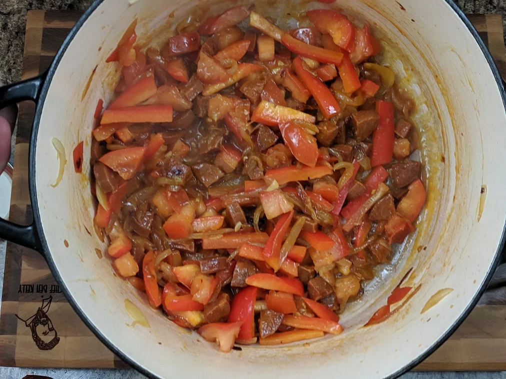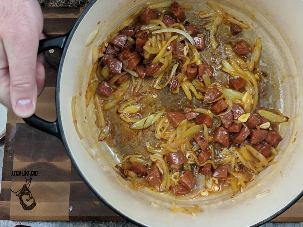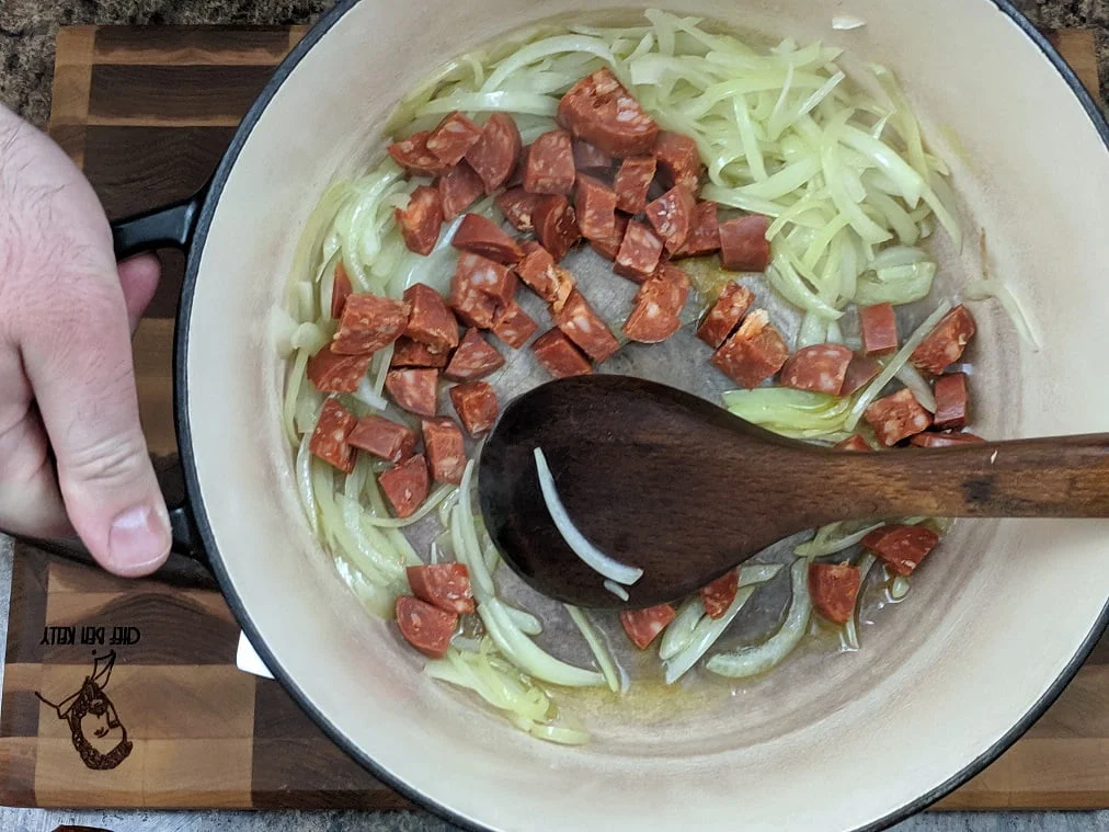 - Add the diced chorizo into the pot and cook for about four minutes.