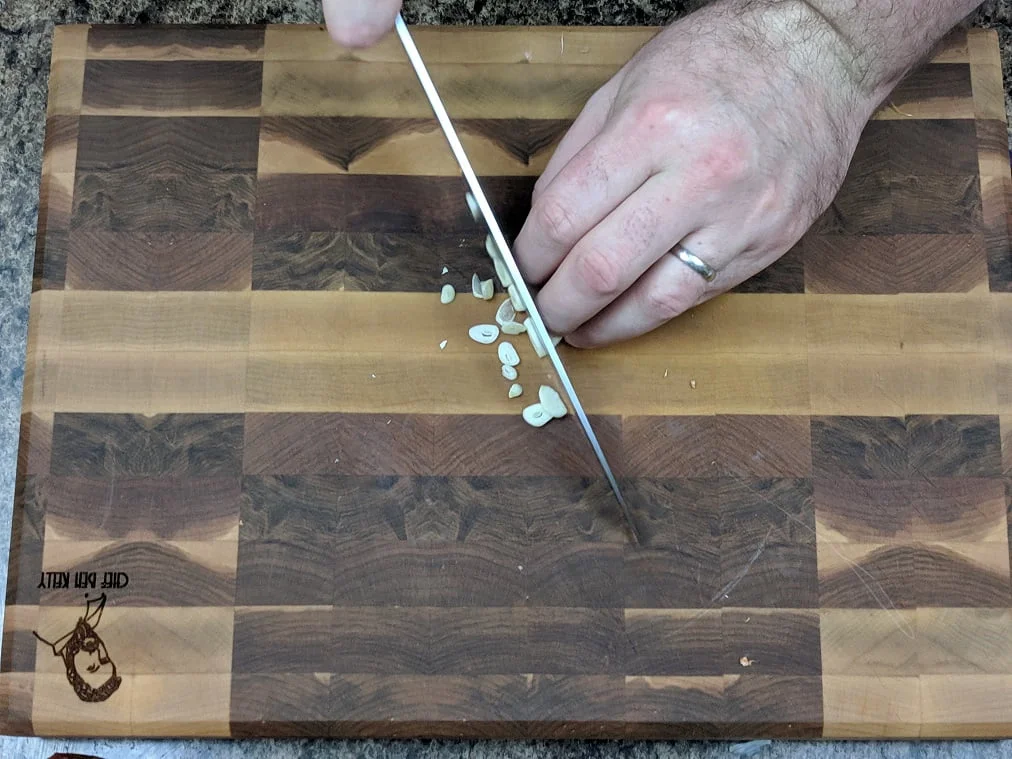 I first cut the ends off the garlic. Then I gently crushed it under the side of my knife and pulled the peel off. All the was left was to thinly slice it.