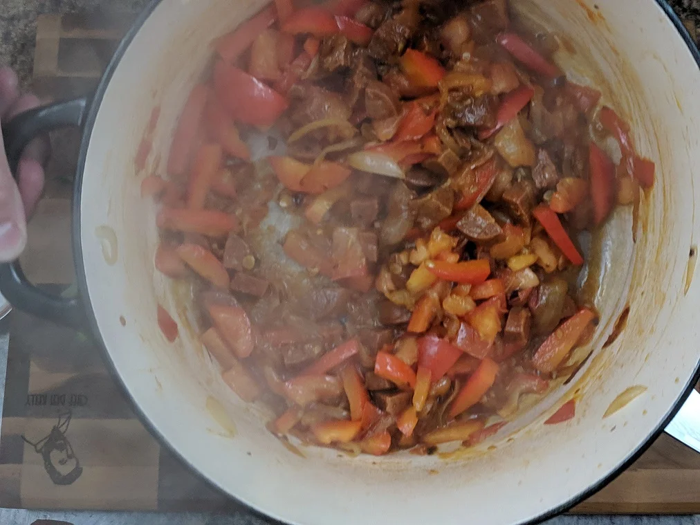 By 7:46 the onions were slightly softened and the chorizo had gone into the pot. It was time to take care of the garlic and red pepper.