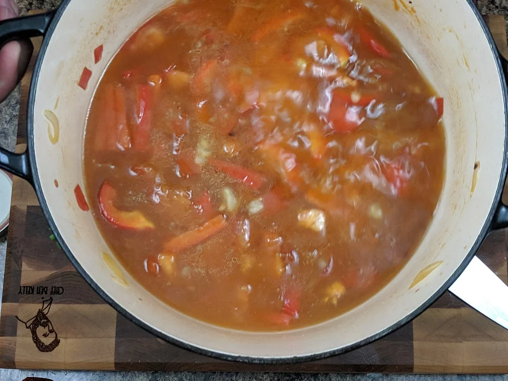 At 7:54 pm I added the red peppers to the pot. While they were cooking I trimmed off the ends of about 20 green beans and then cut them into thirds. Once the beans were cut I added 1 L of chicken stock to the pot. I put the lid on the pot, cranked the heat up to high and waited for the soup to boil.