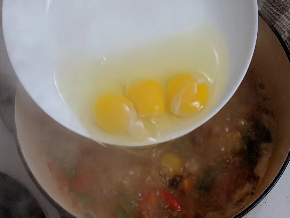 - Turn the heat down to low, add in the eggs one at a time, put the lid back on the pot and simmer for three minutes.