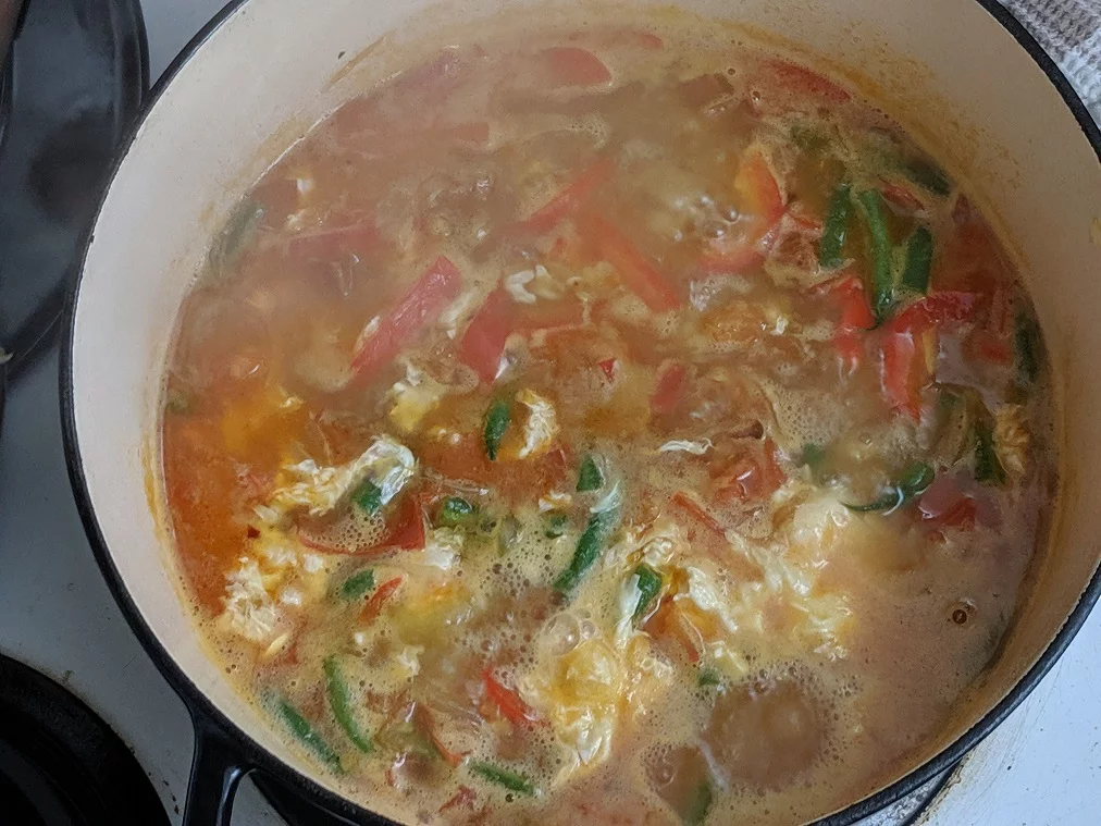 At 8:04 I lowered the heat on the soup to a simmer, removed the lid form the pot and gently poured the eggs in one at a time. I put the lid back on the pot and let the eggs cook for three minutes.