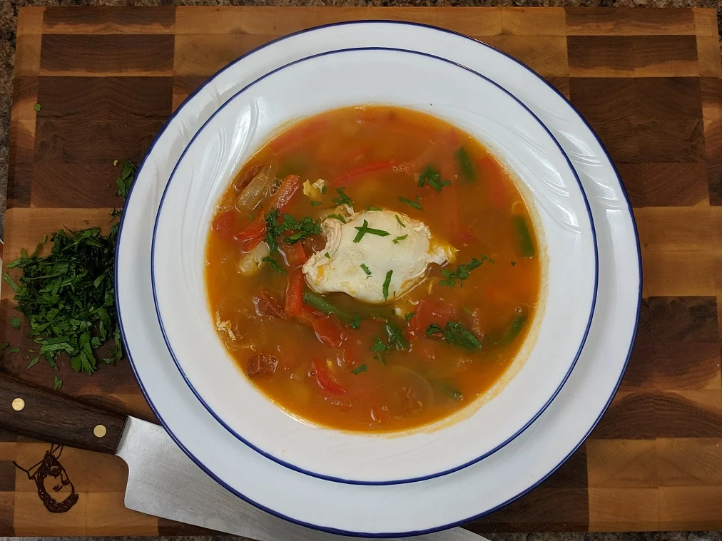 At 8:07 I tasted and adjusted the seasoning of the soup with a bit of salt. I plated the soup with a poached egg in the middle and garnished it with a bit of chopped parsley. And that was that.