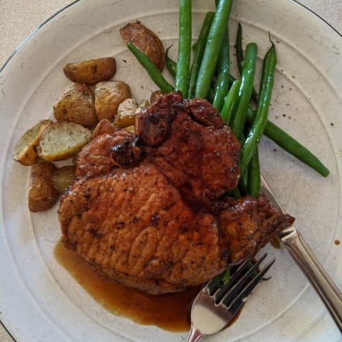 Balsamic and brown sugar glazed pork chops are great anytime, combine them with roasted potatoes and green beans and you have a real winner.