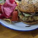 Place the bread and butter pickles on the bottom bun and the salad greens on the top bun. Put the pattie on the bun and serve with the chips.
