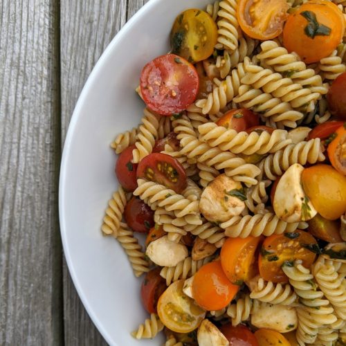 Tomatoes, Basil, Pasta and Fresh Mozzarella, Combined and then Dressed with Olive Oil and a Little Balsamic Vinegar. Is this your new favourite pasta salad? Possibly.