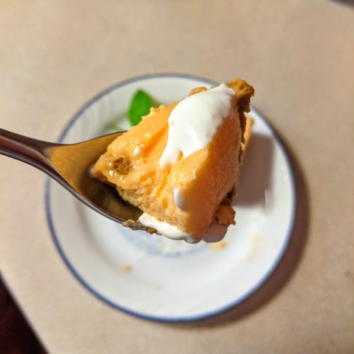 Gently pour the cheese and jello mixture over the cracker crumbs, cover with plastic wrap and put in the fridge to set for at least 3 hours. I found leaving it in the fridge overnight gave the dessert a better texture.
