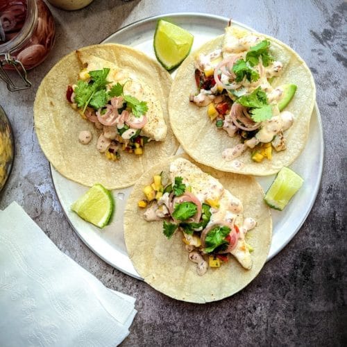 These fish tacos are made with seared halibut, but they work with any fish. Get the fish preparation simple and let the rest of the ingredients do the heavy lifting flavour-wise.