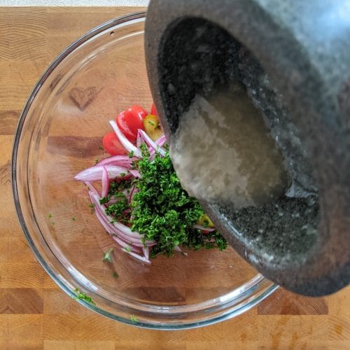 Crush the garlic and salt together and mash to a pulp with the pestle.