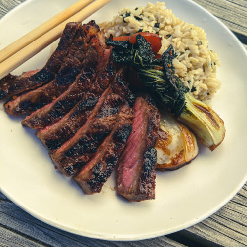 Cook the steak for 1 minute 30 seconds, then rotate by 90°. Cook the steak for another 1 minute 30 seconds, then flip and pour over the remaining marinade. Cook for another two minutes, then remove the steak from the grill, let it rest for 4 minutes then serve.