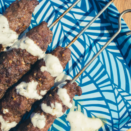Divide the meat in four and form each fourth of meat around a 12-inch skewer. If you are using wooden or bamboo skewers, soak them in water for 1 hour before skewering the meat.