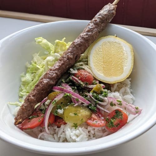 A salad bowl composed of rice, salad, lettuce and a lamb gyro skewer.
