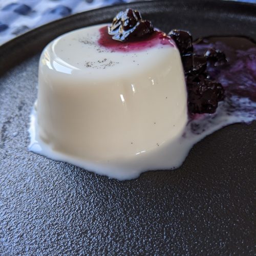 To unmold the panna cotta, dip the ramekin in hot water for 10 seconds, run a knife around the inside edge of the ramekin and invert onto a plate. Tap gently until the panna cotta releases. Serve with blueberry sauce or a fruit preserve.