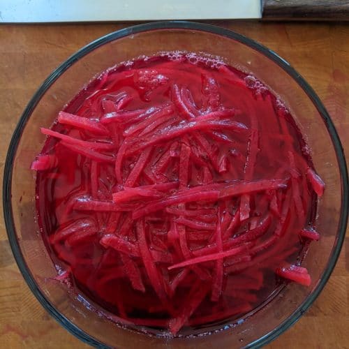 Pickled turnip is a classic topping for shawarma or falafel and its easy to make. Serve it with pork chops, or grilled chicken breast too.