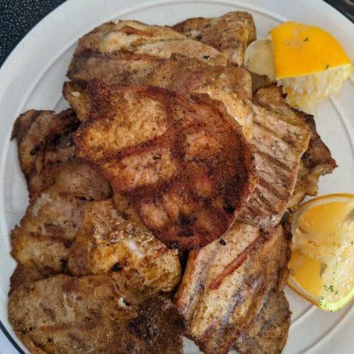 Heat your grill to 400°f for 10 minutes. Lay the pieces of pork loin on the grill and cook for 2 to 3 minutes per side with the lid down. Once the pork is cooked, squeeze the juice out of the lemon over the pork and serve.