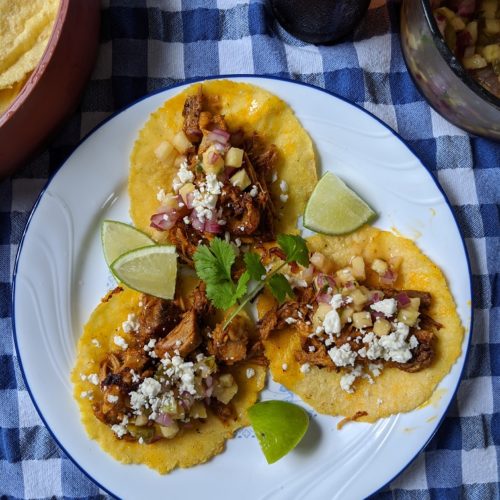 Shred the pork into the juices that have accumulated in the roasting pan. Taste adn adjust the seasoning with salt, pepper, and lime juice as needed.