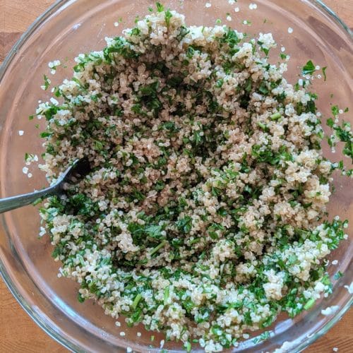 In a medium mixing bowl, combine the cooked quinoa, parsley, lemon zest and juice, olive oil and salt. Mix well.