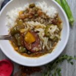 Bring the gumbo back to the boil, reduce the heat, put a lid on the pot and simmer for about an hour making sure to stir every 10 minutes or so, so that it doesn't stick to the bottom of the pan.