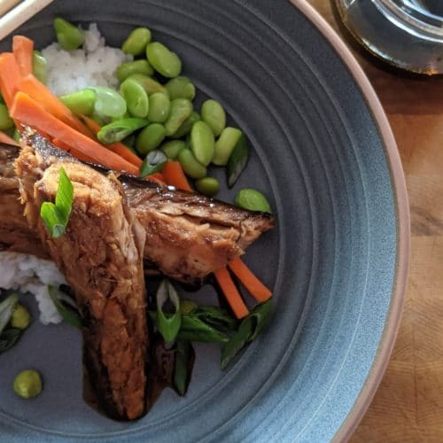 Divide the cooked rice among two plates. Top the rice with the edamame, carrots, mackerel, teriyaki sauce, and scallions. Put a few dots of wasabi around the plate.