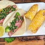 A quick recipe for steak tacos with chimichurri and ancho and lime corn on the cob.