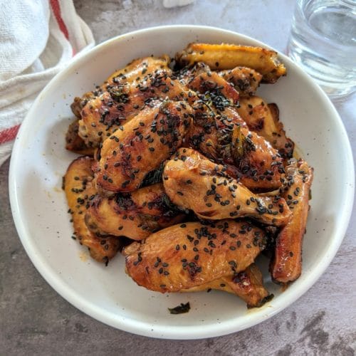 Take the wings out of the oven, put them in a medium mixing bowl, toss with the sauce and serve.