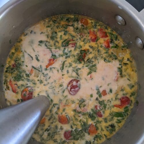 Put the roasted vegetables in a medium pot over medium heat and add in the milk.