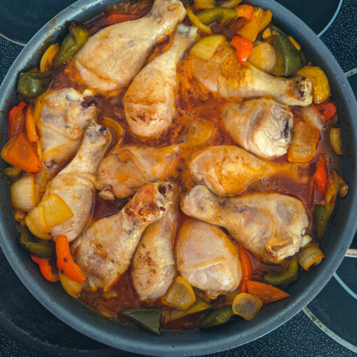 Remove the seared chicken from the pan and set it aside. Drain the excess fat out of the pan and add in the bell peppers, onion, and garlic. Cook for 5 minutes.